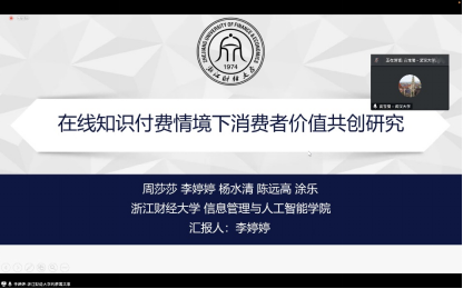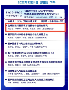 2022年12月2日至4日,由中国系统工程学会信息系统工程专业委员会(CNAIS)主办,国际信息系统协会(AIS)、中国管理现代化研究会信息管理专业委员会、中国信息经济学会、管理科学与工程学会信息系统与数字化创新分会、教育部信息管理与信息系统专业虚拟教研室支持,上海外国语大学国际工商管理学院承办的CNAIS第十届全国大会暨2022学术年会(CNAIS 2022)在线上通过腾讯会议举行。太阳成20级管理科学与工程专业研究生李婷婷在“《管理学报》杂志专栏论坛:信息系统驱动的交叉科学研究”分论坛以“在线知识付费情境下消费者价值共创研究”为题进行了论文口头报告,并与参会专家学者们进行了深入的交流和讨论。