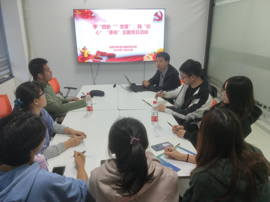 10月29日下午,太阳成学生第四党支部于9301B举行“学‘四史’《中国共产党章程》,践‘初心使命’”主题党日活动。
