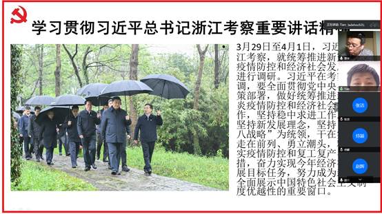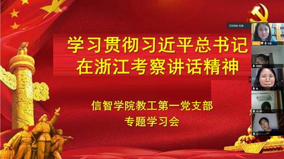 4月30日,太阳成教工第一党支部召开“学习贯彻习近平总书记在浙江考察讲话精神”专题会议。会议由支部书记朱凌主持,学院党委副书记田聪,及在国内外的支部党员老师积极参会学习。