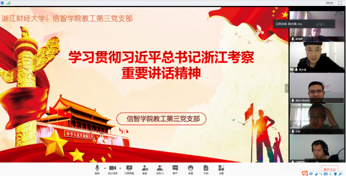 2020年4月23日,suncitygroup太阳成集团信息管理与人工智能学院教工第三党支部开展理论学习,专题学习贯彻习近平总书记浙江考察重要讲话精神。会议由支部书记杨水清主持,支部成员参加学习。