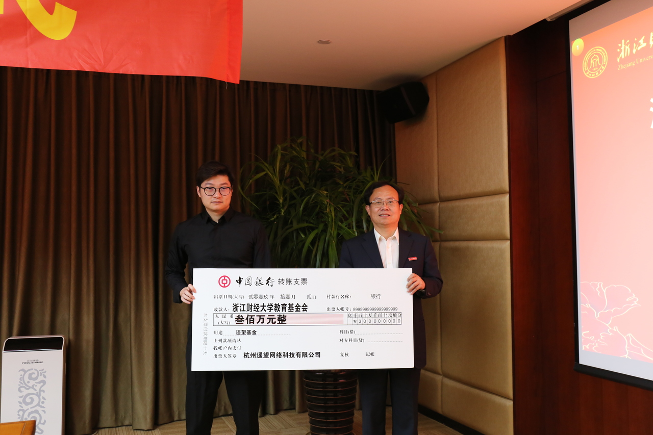 2019年11月2日下午15:30,suncitygroup太阳成集团信息管理与工程学院举办“遥望基金”捐赠签约仪式。出席本次签约仪式的有杭州遥望网络科技有限公司董事长兼CEO谢如栋校友,校友总会会长、校党委书记李金昌,校友总会副会长兼秘书长、党委副书记黄建新,党校办副主任郑纪达,校友总会办公室主任马亦群,计划财务处处长童玉玲,教务处副处长石向荣,信工学院院长张文宇等,签约仪式由信工学院党委副书记陆颋浩主持。