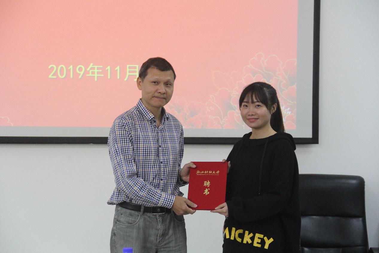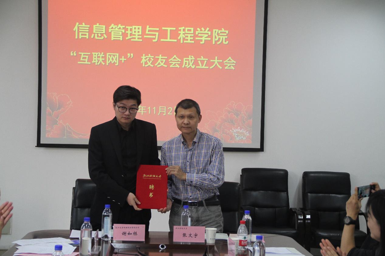 随后,陆颋浩宣读“互联网+”校友会章程草案,会员共同审议并通过草案,“互联网+”校友会正式成立。陆书记宣读会长、副会长、秘书长副秘书长名单草案,由会员集体审议通过。张文宇院长为各位校友颁发聘书。