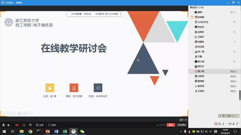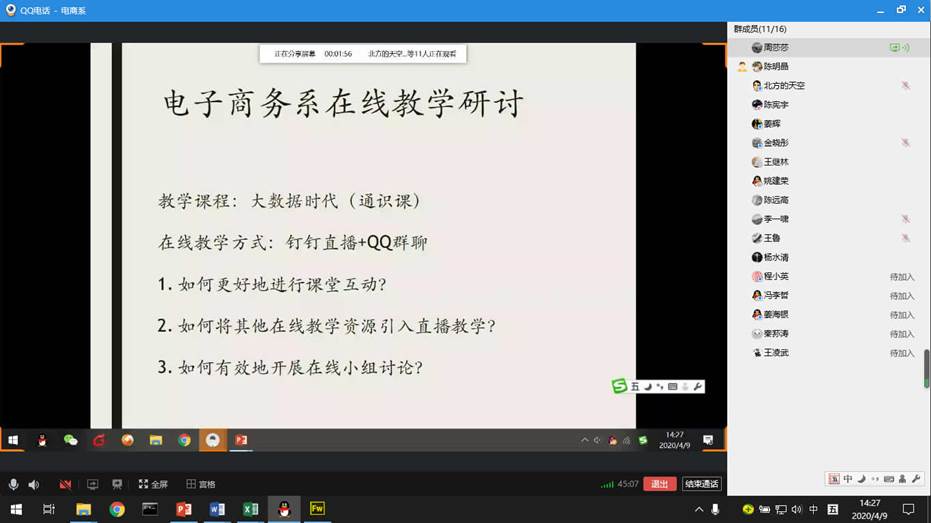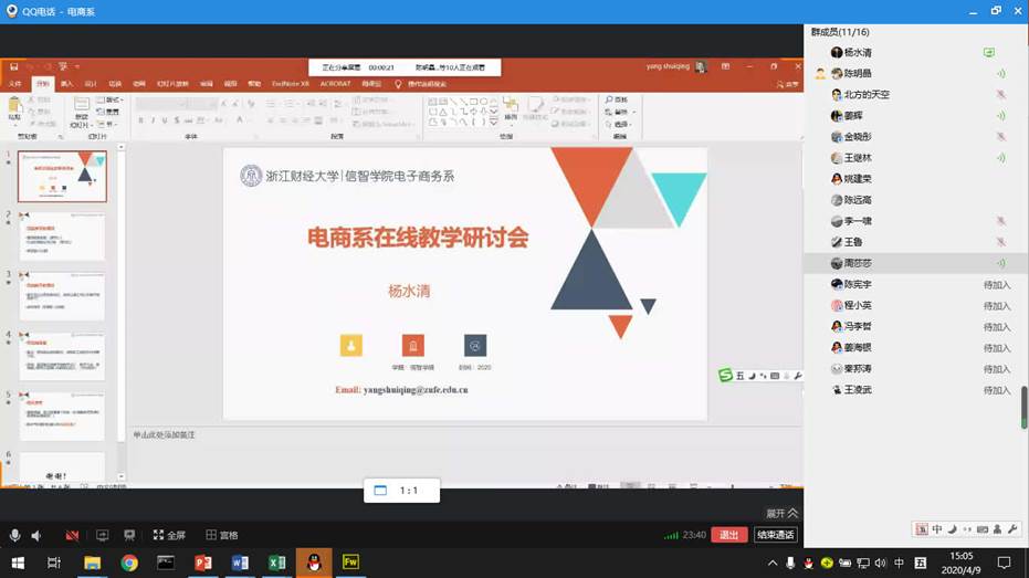 本次会议于4月9日下午2:00-4:00通过QQ群电话进行。会议分为两个阶段,在第一阶段的在线教学研讨中,姜辉介绍了在提高学生参与积极性、提升教学效果等方面的做法,周莎莎分享了通识课中组织学生研讨和引用优秀在线资源的若干方法,陈明晶介绍了课程思政的应用情况以及在线上教学中的应对措施,杨水清以研究生的教学为例提出了在线研讨式教学的思路,与会教师还深入讨论了在线教学过程中碰到的诸多问题及对策。