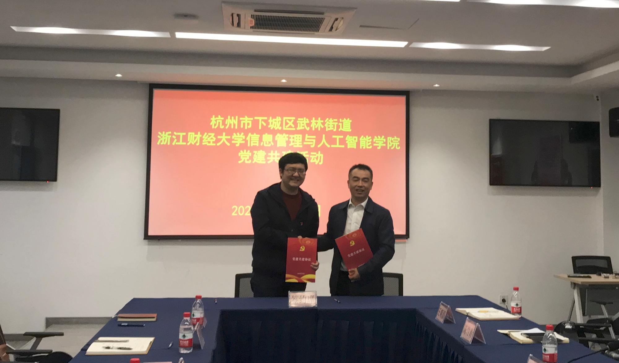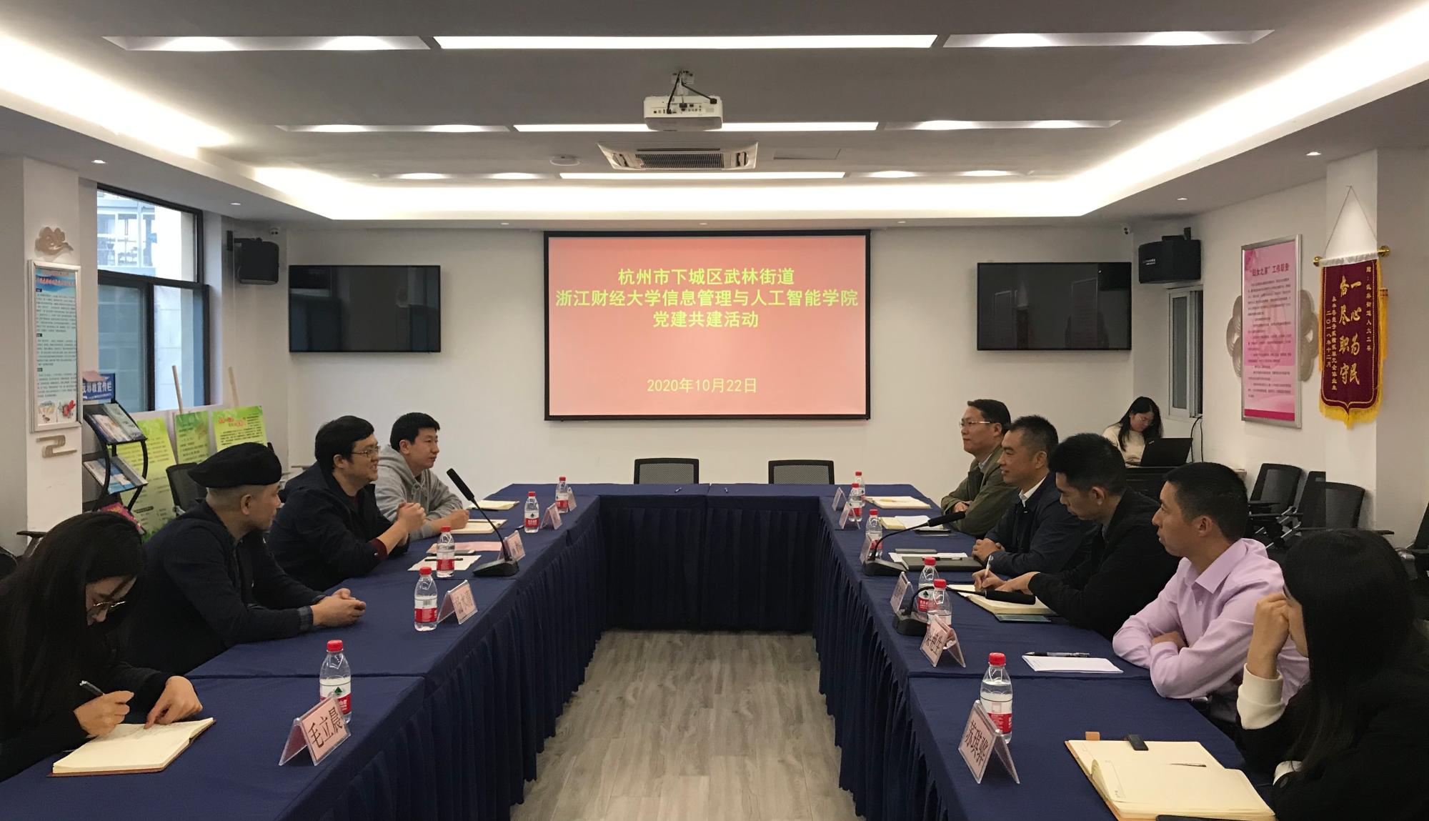 随后,双方党委在武林街道党群服务中心会议室开展了党建共建活动。太阳成党委书记徐奇伟介绍了学院的基本情况、学科优势和特色党建工作,并希望能在教工和学生两个层面,从社会实践、志愿服务、技术交流、人才合作等多方面加强与武林街道党工委的交流合作。武林街道党工委书记唐国宏介绍了街道党工委如何借助党群服务驿站,在优化“武林店小二”平台服务、疫情复产复工、民生保障服务、智慧养老服务、数字街道综合、武林非遗市集、文化家园建设和基层治理等方面推进党建引领工程。另外,学院与会党员老师还就人才培养、社会服务、宣传和团委等工作与武林街道党工委副书记梅育生,武林街道党建办主任、机关党总支书记梁艳生和武林街道团委副书记苏琪骅展开了交流。