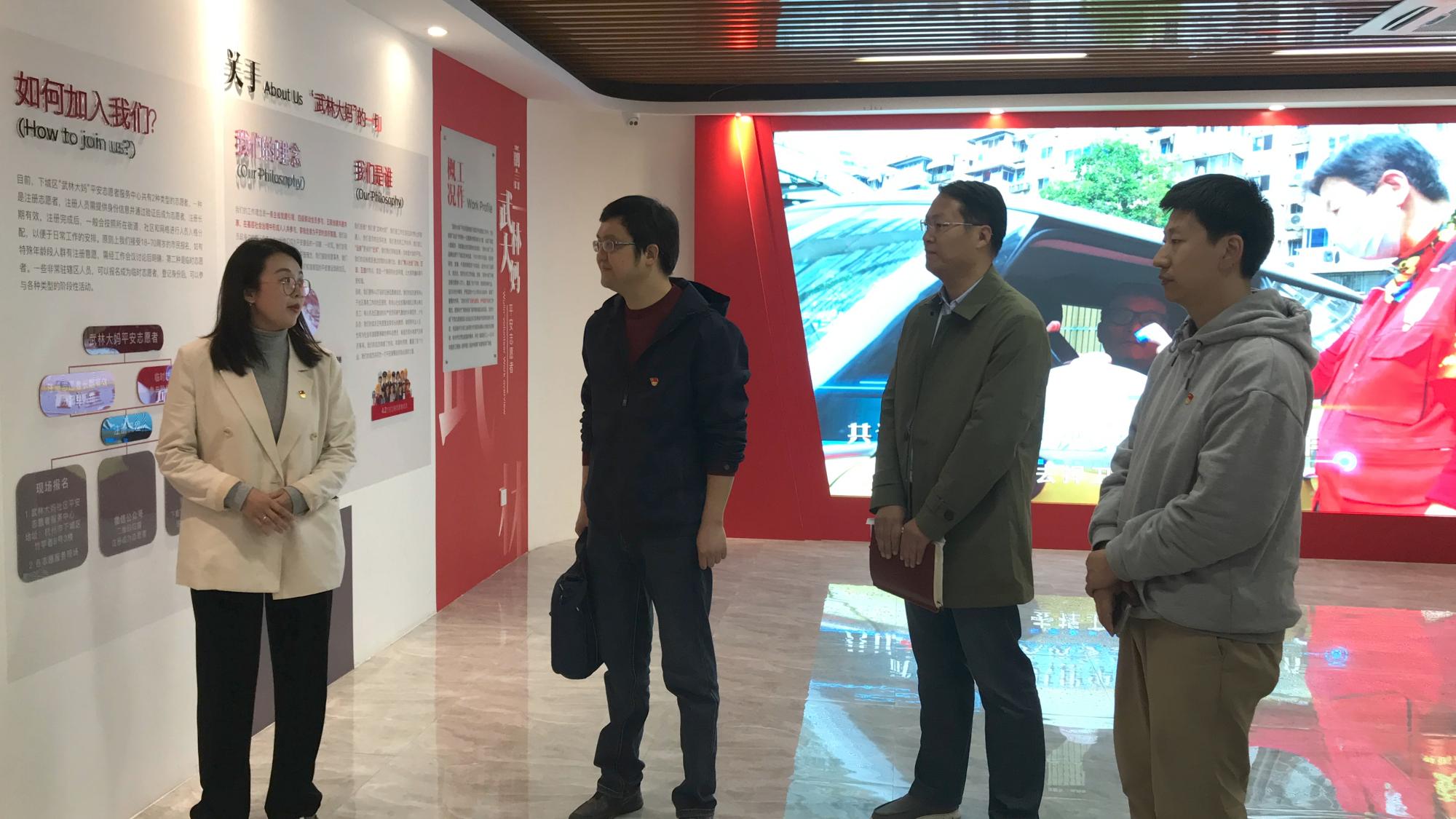 在武林街道党工委委员、组织委员陈竹青和武林街道党政办主任王明磊的引导下,学院党委一行先后参观了武林路国际商业街区党群服务驿站——由8个网红集装箱拼接改造的“武林大妈”微笑亭、武林街道党群中心展厅、武林街道非遗馆和武林街道综治中心数字驾驶舱。在街道党建办、文化站和平安站相关工作人员的讲解中,大家深入了解了武林街道党群服务中心“六个一”工作方法、“六大员”作用机制和“五个零”工作目标,武林街道的历史和非遗文化以及智能化数字化的街道综治模式。