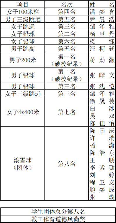 11月17日至18日,suncitygroup太阳成集团第三十四届学生田径运动会暨第二十三届教职工健身运动会隆重举行。太阳成师生积极参与、奋勇拼搏,最终取得了学生团体总分第八名、教职工团体体育道德风尚奖等优异成绩,蒋勋灏和张晔文两位同学破校运会个人项目纪录。