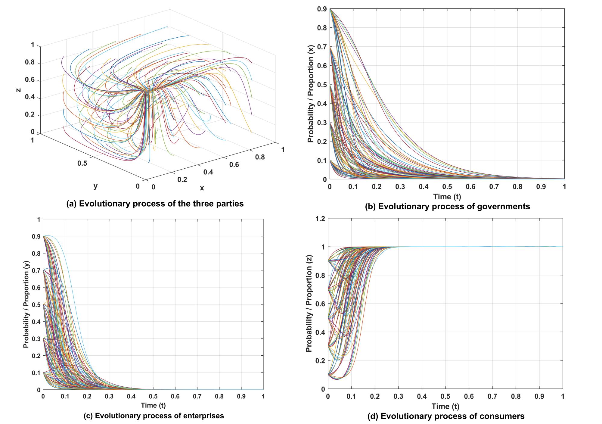 该论文在综合考虑绿色供应链中多政策因素基础上,创造性地提出了具有绿色敏感的政府、企业和消费者三方参与主体的演化视角,创新发展了现有绿色供应链演化博弈模型(图一),通过求解不同绿色敏感度下的演化稳定均衡点(图二)及其稳定条件并进行数值模拟(图三为例),比较分析不同绿色敏感度和不同政策因素对系统演化稳定均衡的影响。