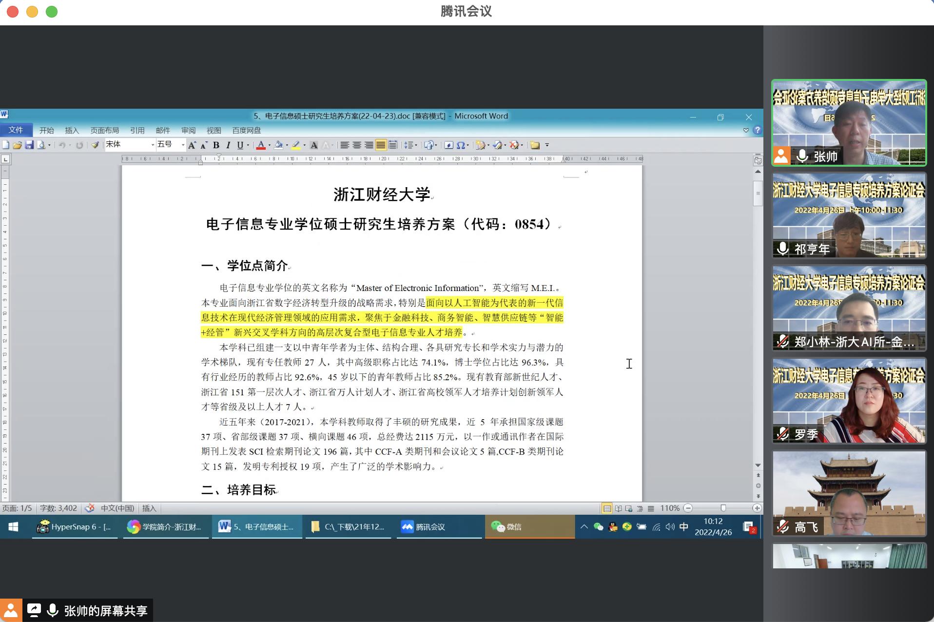 4月26日,太阳成在404会议室召开了电子信息专业学位研究生培养方案线上线下同步论证会。浙江大学计算机学院郑小林教授、浙江省专业硕士教学指导委员会委员、浙江工业大学计算机学院高飞教授、浙江工商大学学科办主任杨柏林教授、湖州师范大学研究生院院长祁亨年教授、杭州电子科技大学计算机学院副院长邬惠峰教授、研究生院副院长罗季教授等专家应邀参会。本次论证会由学院院长张帅教授主持,电子信息部分骨干教师参加了会议。