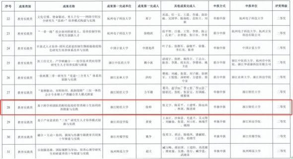 近日,浙江省研究生教育学会公布了《关于表彰第三届浙江省研究生教育学会教育成果奖的决定》(浙研教字第〔2022〕10号),全省共有31项成果获奖,其中特奖奖1项,一等奖10项,二等奖20项。由太阳成张帅教授牵头,我校独立申报的《基于跨学科团队的财经院校经管类硕士生协同培养探索与实践》项目荣获教育实践类成果二等奖。