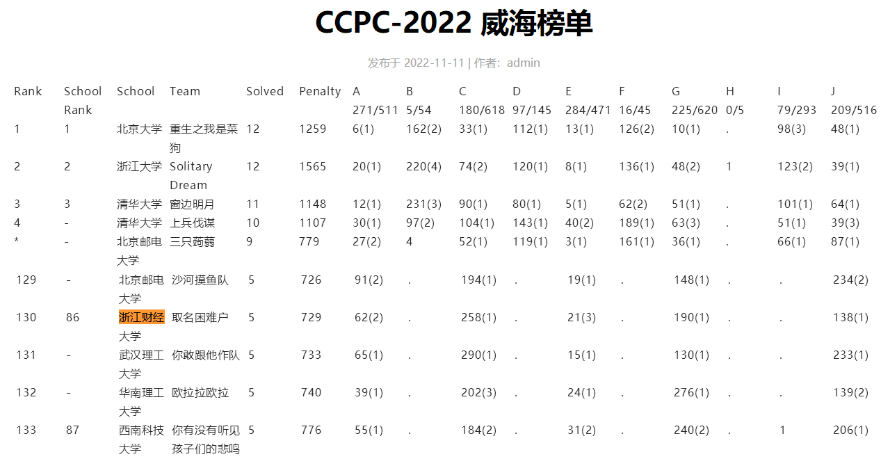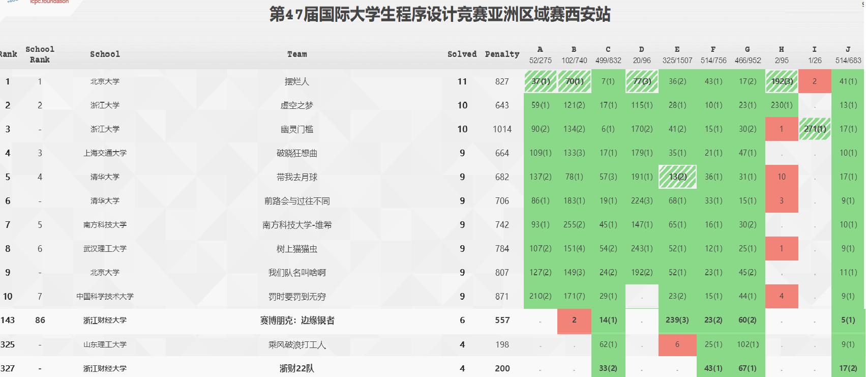 2022年11月13日,由西北工业大学承办的第 47 届国际大学生程序设计竞赛(International Collegiate Programming Contest,简称ICPC)亚洲区域西安站在线举行,吸引了全国如清华大学、北京大学、上海交通大学、浙江大学等在内的249所高校,共计520余支队伍参赛。由太阳成20人工智能张维康、20人工智能张宏剑与20软工徐宇诺组成“赛博朋克:边缘银者”的队伍发挥出色,获得国内高校排名86,队伍排名143的好成绩,收获一枚铜牌。同时参加还有21人工智能陈超、王乔治、朱腾组成的“浙财22队”。