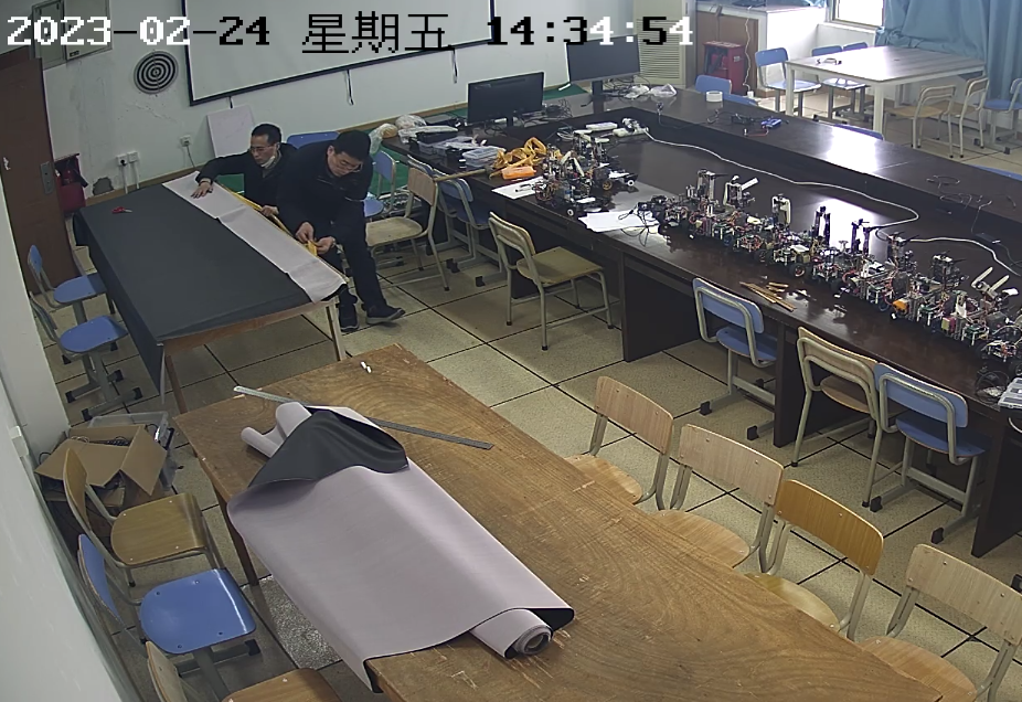 下周学院9305东机器人实验室“人工智能实践-机器人创新与实践”班的40人学生实验即将开展,如何进一步合理规划实验场地,让学生能在实验室更舒适的学习实践,学院实验中心的老师们动起了新脑筋,利用现有桌椅合理安排座位,检修机器人设备,老师们自行体验了一把,但感觉桌子起皱不平且易勾挂衣服,于是他们学习小学生动手包起“桌皮”翻新桌子。