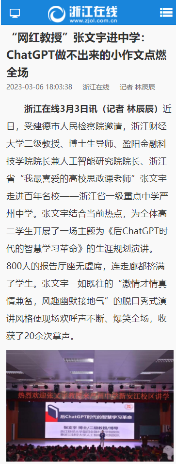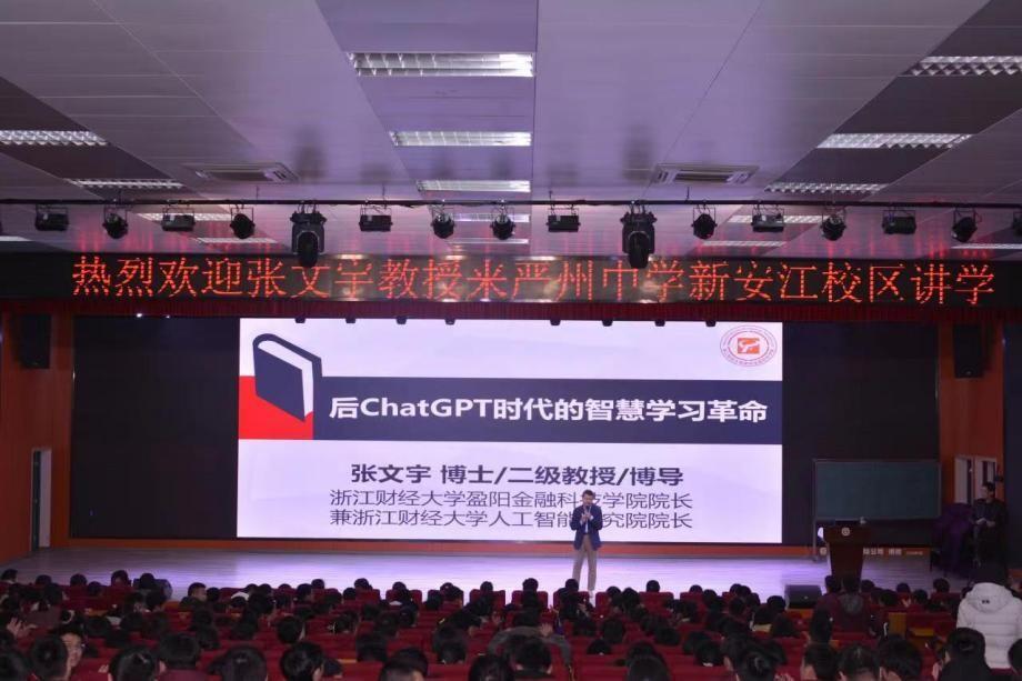 近日,受建德市人民检察院邀请,suncitygroup太阳成集团二级教授、博士生导师、盈阳金融科技学院院长兼人工智能研究院院长、浙江省“我最喜爱的高校思政课老师”张文宇走进百年名校——浙江省一级重点中学严州中学。张文宇结合当前热点,为全体高二学生开展了一场主题为《后ChatGPT时代的智慧学习革命》的生涯规划演讲。800人的报告厅座无虚席,连走廊都挤满了学生。张文宇一如既往的“激情才情真情兼备,风趣幽默接地气”的脱口秀式演讲风格使现场欢呼声不断、爆笑全场,收获了20余次掌声。