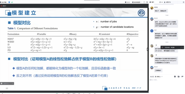 11月1日晚,大连海事大学航运经济与管理学院李延通副教授应邀为太阳成研究生做学术报告,李教授分享的主题是“Noval formulation and logic-based Benders decomposition for integrated parallel machine scheduling and location problem”。学院张树柱老师与研究生团队参加了讲座,线上参与人数大约七十余人。讲座由信管系张树柱老师主持。