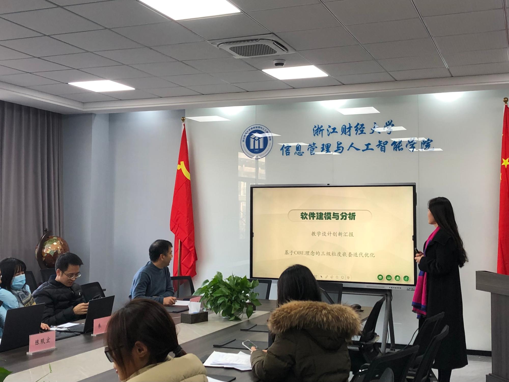 比赛开始前,陈明晶老师介绍本次大赛的基本情况,鼓励教师们互相交流,以赛促教,不断提高教学能力和水平。随后,王婉茹老师、王盼盼老师、杨亚老师、林玮玮老师、张翔老师依次进行了教学设计创新成果汇报,结合教学大纲与自身的教学实践经验,从教学模式、教学内容和教学评价等方面展示了课程教学的创新成效,并与评委展开交流。