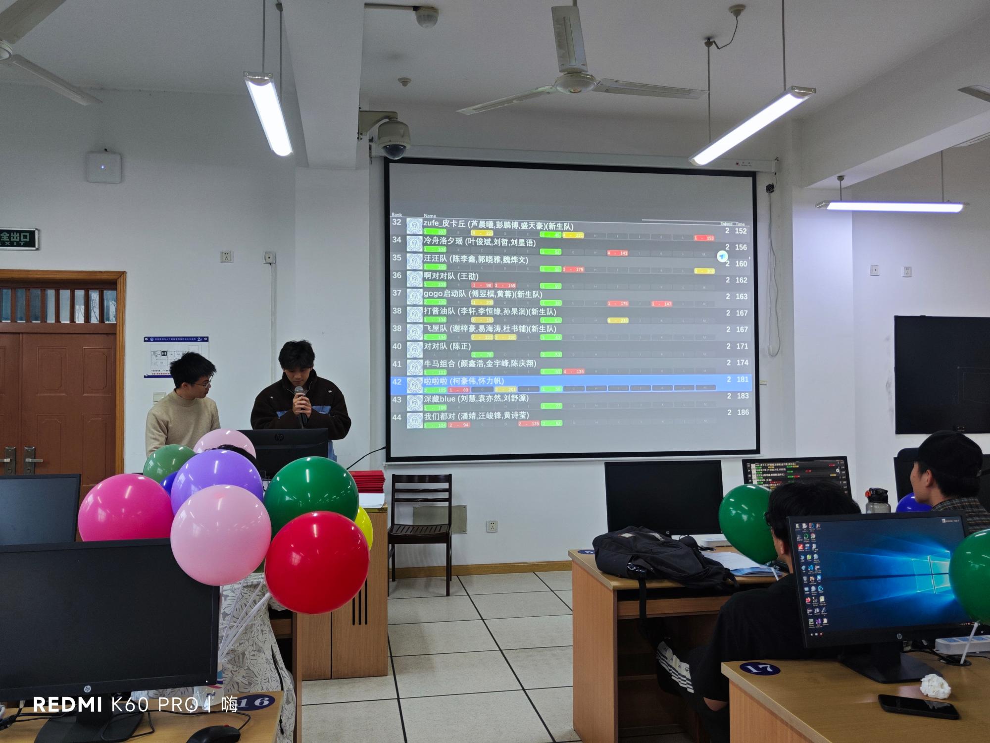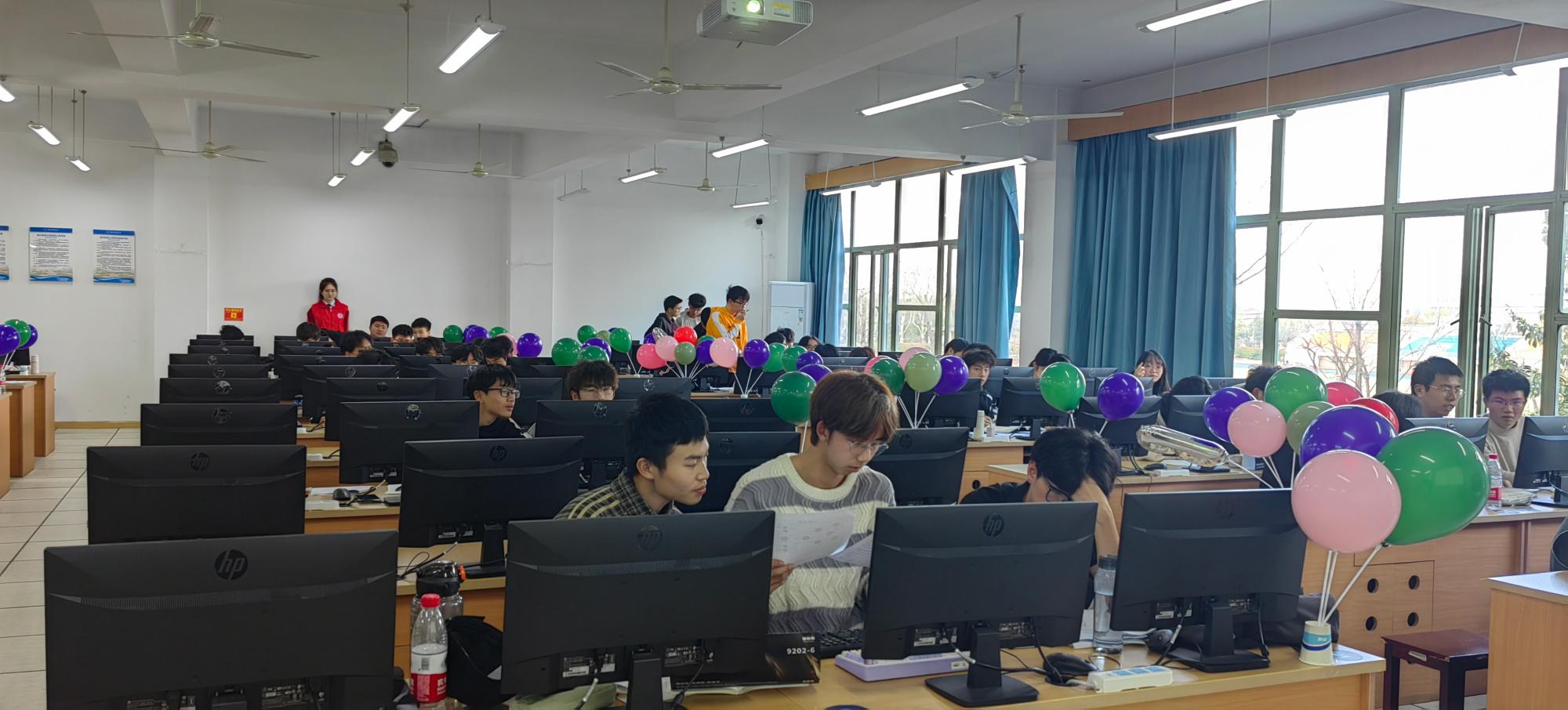 开幕式结束后,比赛于下午13:30正式开始,选手们争分夺秒,团队间通力合作,集思广益,共同解决问题。选手每答对一题都会有志愿者为本队送上一个与本题颜色匹配的气球,每题第一队答对的选手还可以额外获得一个“首杀气球”。在计算机ACM协会与信息技术协会工作人员以及志愿者的认真辛勤的共同努力下,比赛有条不紊地顺利进行。