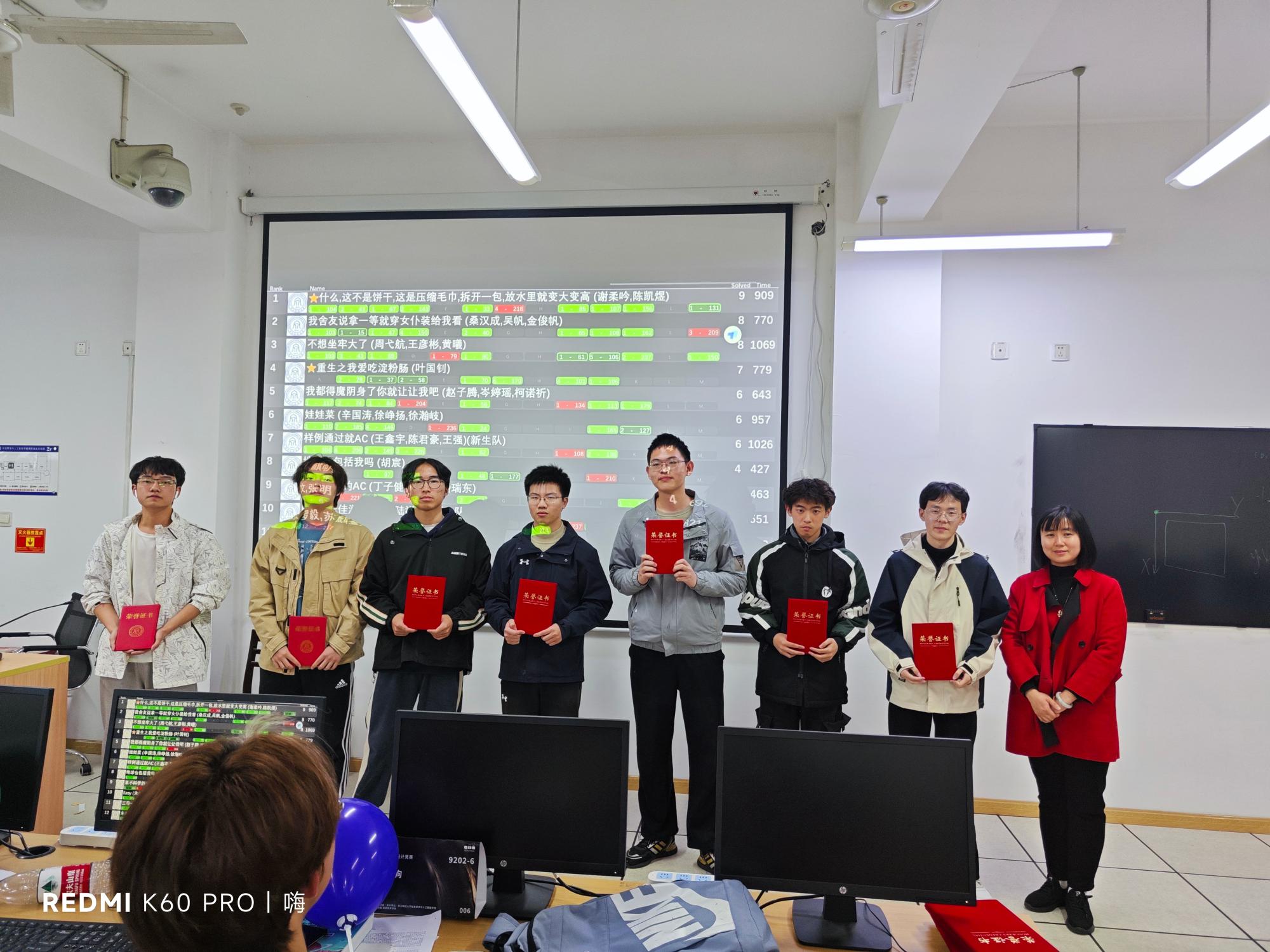 四个小时的答题时间转瞬即逝,本次比赛于下午17:30准时结束。闭幕式上,经过紧张激动的滚榜环节,获奖名单随之而出。本次比赛获奖人员共94人,其中三等奖47人,二等奖28人,一等奖19人,同时评出“最佳新生队”和“顽强拼搏奖”,并由副院长朱凌以及陈琰宏、杨泽等老师、张垚垚、冯裕钵等命题组成员为获奖同学颁奖。