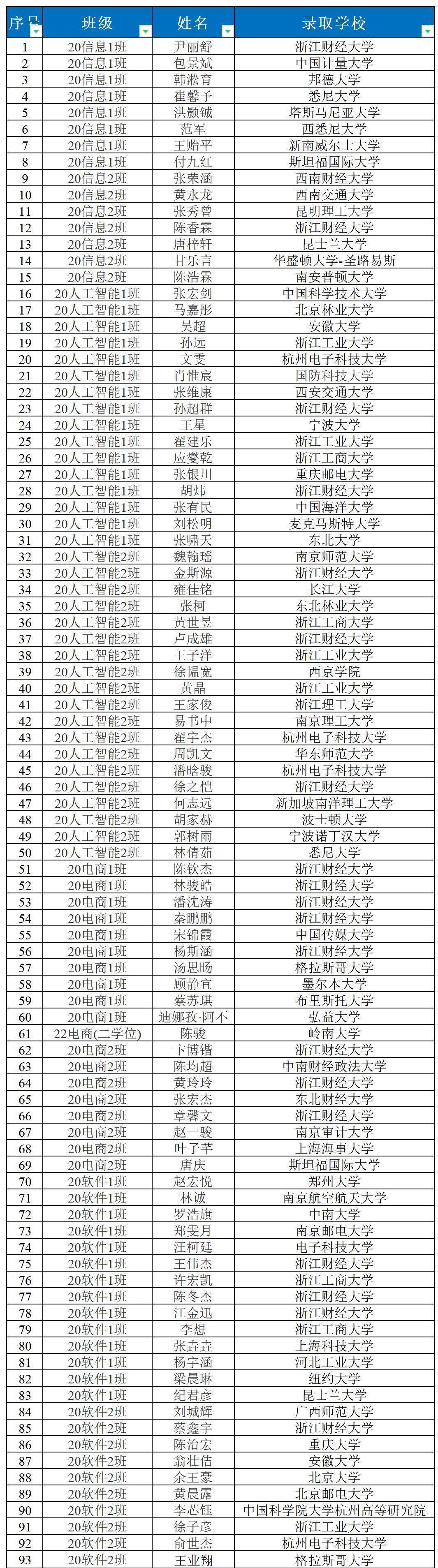 截至2024年6月,学院共有93人考取国内外研究生。其中,27人考取北京大学、西安交通大学、国防科技大学、中国科学技术大学等“双一流”高校,较去年同期增加8人;13人考取新加坡南洋理工大学、纽约大学等QS世界排名前100国(境)外高校。出国(境)升学数据将持续更新。