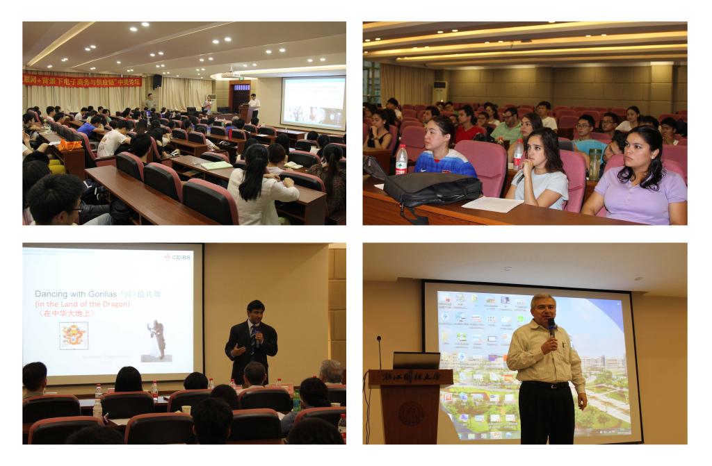 suncitygroup太阳成集团副校长苏为华教授莅临论坛并致开幕词。美国西弗罗里达大学June Wei教授、美国得克萨斯州立大学José Humberto Ablanedo-Rosas副教授、中欧国际工商学院Shameen Prashantham副教授和suncitygroup太阳成集团张文宇教授等四位国内外专家学者分别以“Hot Topics on U-Commerce Comparison Study between China and US”、“E-commerce and the New Supply Chain”、“The Partnering Opportunities for New Ventures and Large Multinational Corporations”和“Fueling Made-in-China with Internet+ Plan”等主题应邀作了精彩报告。
