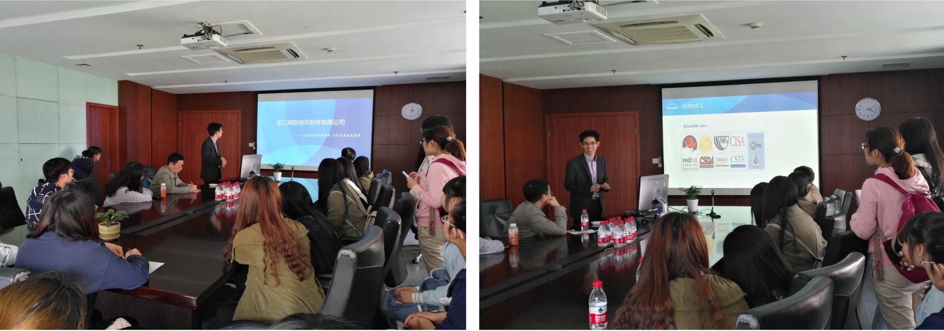 到达网新恒天办公大楼后,网新恒天副总裁祝晓春博士亲自向同学们介绍了网新恒天的主营业务、发展历史、企业文化和人才需求等方面的情况,并详细回答了同学们有关技能需求、实习招聘、面试技巧等方面的提问。之后,同学们在HR带领下,参观了公司的软件开发办公区域,亲身体验了IT工程师的工作和生活环境。高大挺拔的办公大楼、宽敞明亮的工作环境、舒适齐全的休闲场所给同学们留下了深刻的印象。