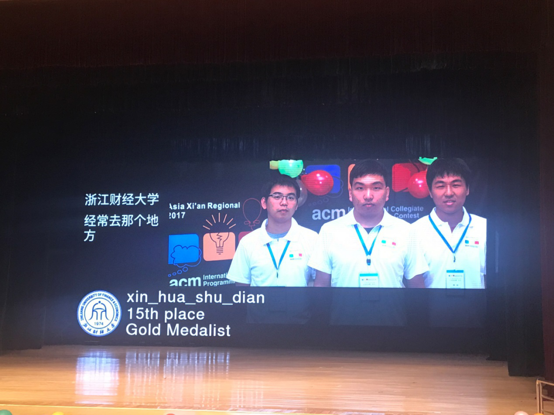 5月20日至21日,2017年ACM国际大学生程序设计竞赛全国邀请赛在陕西省西安市西北工业大学举行,来自全国122所高校的293支队伍参加了比赛。经过5个小时激烈角逐,由太阳成14计算机项闰冶、14软件周甄陶、14软件王瑞洲组成的代表队在293支队伍中排名第15,荣获金奖一枚。