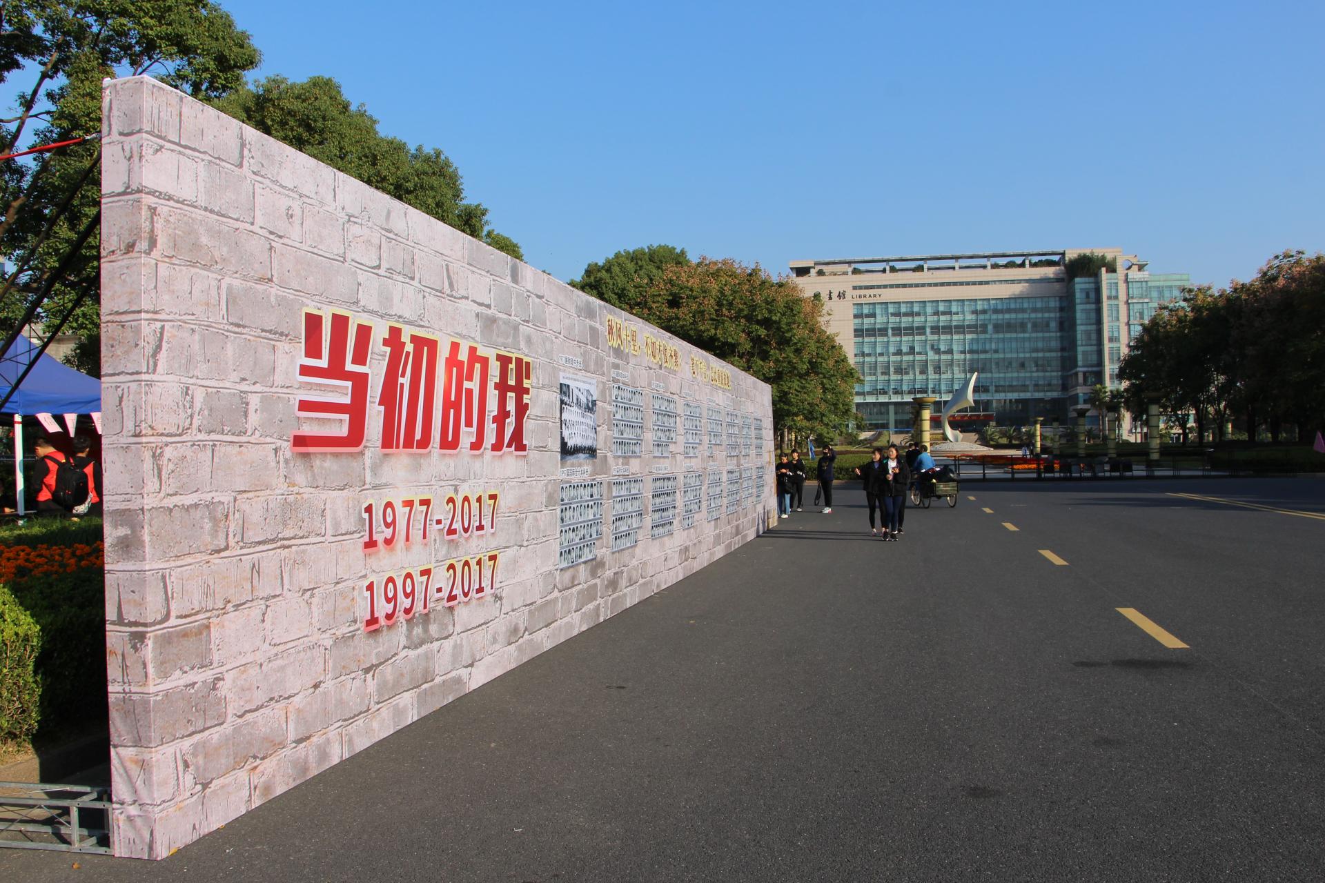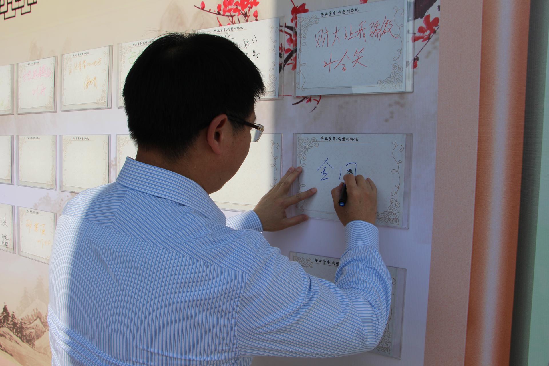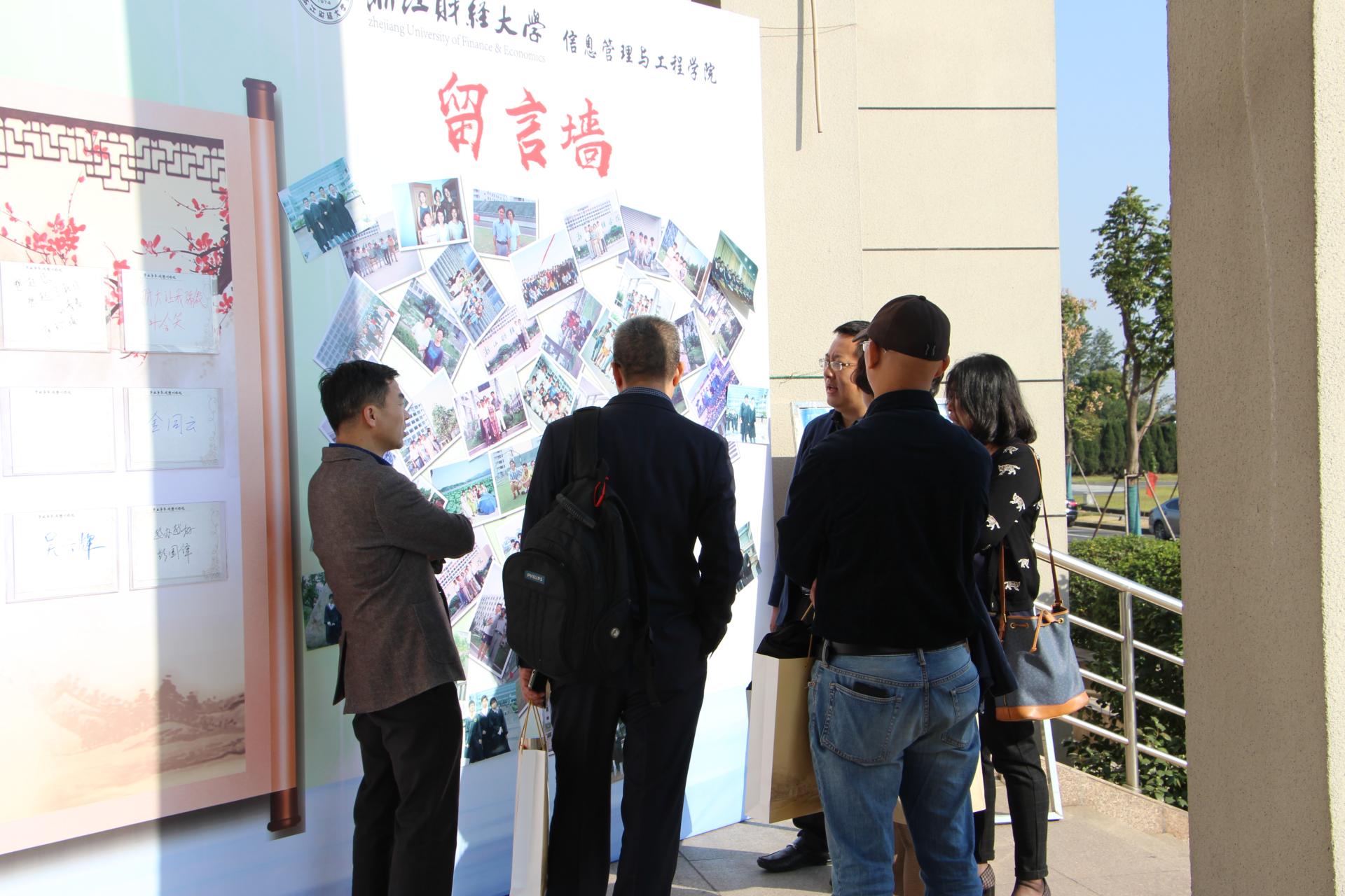 学院寻找所有过去的老照片,拼凑成一面留影墙,更是一面回忆墙,校友们不禁寻找仔细寻找当年的自己,“你看呀,你怎么一点都没变。”留影墙前有沉思,有激动拥抱,有泪花含在眼眶里。留影墙旁设有“毕业多年,我想对你说……”校友签名留言墙,其上各种留言有签名、有对母校的祝福,有对自己的心情抒发,不一样的笔迹里带着同样的依依眷恋之情。