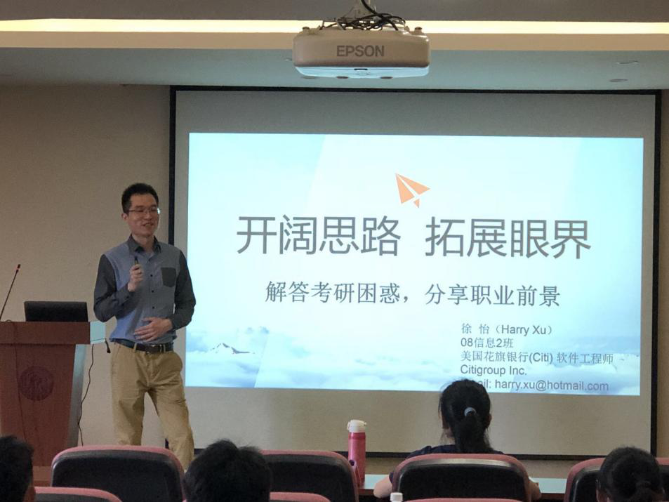 2018年4月12日14时,于9302,原08级信息2班北大硕士生徐怡为太阳成学生带来了精彩纷呈的考研经验分享会。分享会上,学长亲切地为同学们解答考研困惑,分析职业前景,现场氛围活跃融洽。