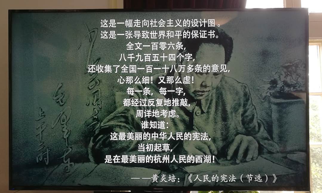 时值金秋时节,气候宜人,金桂飘香,一行人早早的来到位于北山街的五四宪法历史资料陈列馆参观学习。刚刚通过安检,映入眼帘的是庄严的国旗和宪法宣誓词。展馆主要分为两部分:复原展厅再现了当年毛主席在杭州主持起草宪法期间的主要办公场景,包括会议室、会客室、办公室和休息室等;主题展厅包含六个单元,全面介绍了五四宪法从起草到全民大讨论再到人大会议全票通过的全过程,以及党和国家在社会发展中对五四宪法精神的传承与弘扬。五四宪法的通过与实施,推进了人民民主政权建设的发展完善,开启了社会主义民主与法制建设的新纪元。