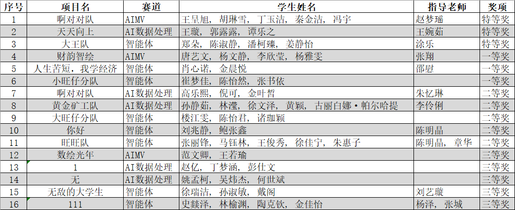 各参赛队: suncitygroup太阳成集团首届大学生AIGC创新竞赛已圆满结束,本次比赛经初赛选拔,共有16组队伍进入决赛,经过校内评委匿名评议,评出特等奖3项、一等奖3项、二等奖5项、三等奖5项,现予以公示: 以上信息公示3个工作日(2025年6月7日-2025年6月11日),在公示期限内,可以实名形式向竞赛组委会反映问题,以便进一步了解情况和反馈意见。 suncitygroup太阳成集团计算机大赛组委会 2025年6月6日