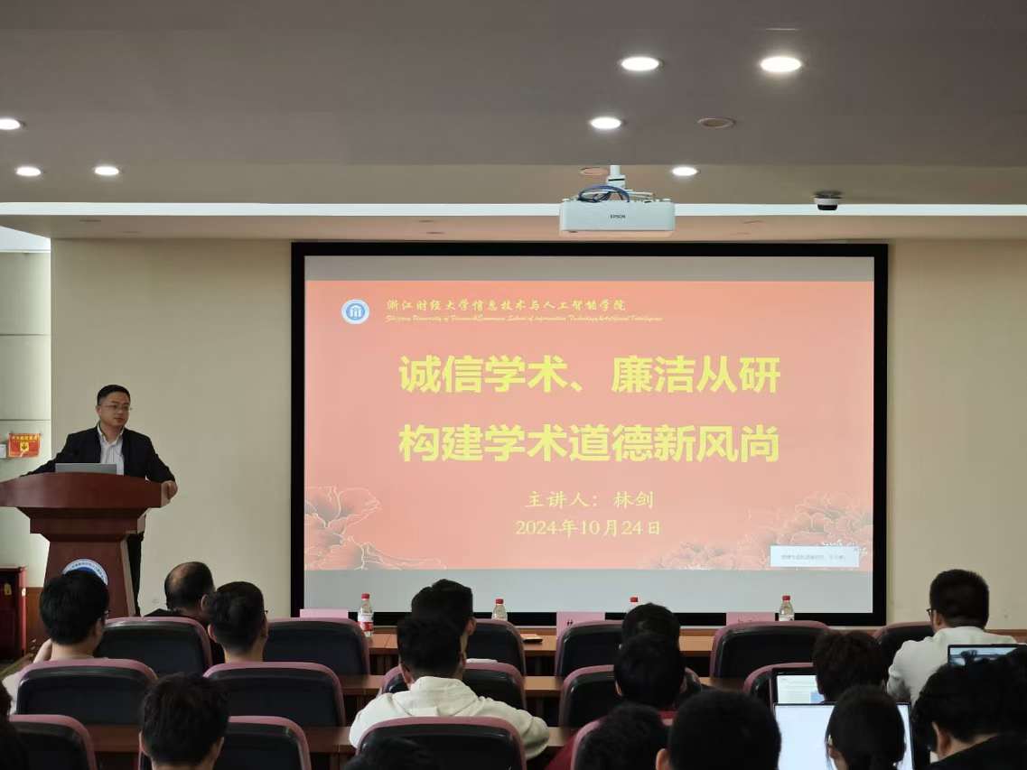 接着,林剑教授分享了自己在学术研究中的经验和心得,鼓励大家在追求学术成就的同时,更要注重学术道德的修养。他提出,廉洁从研不仅是个人品德的体现,更是科研环境健康发展的保障。