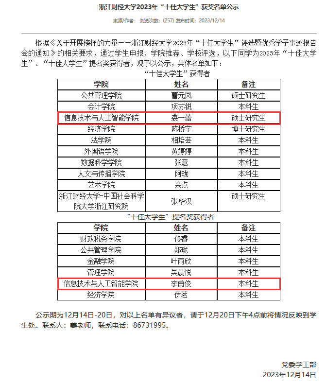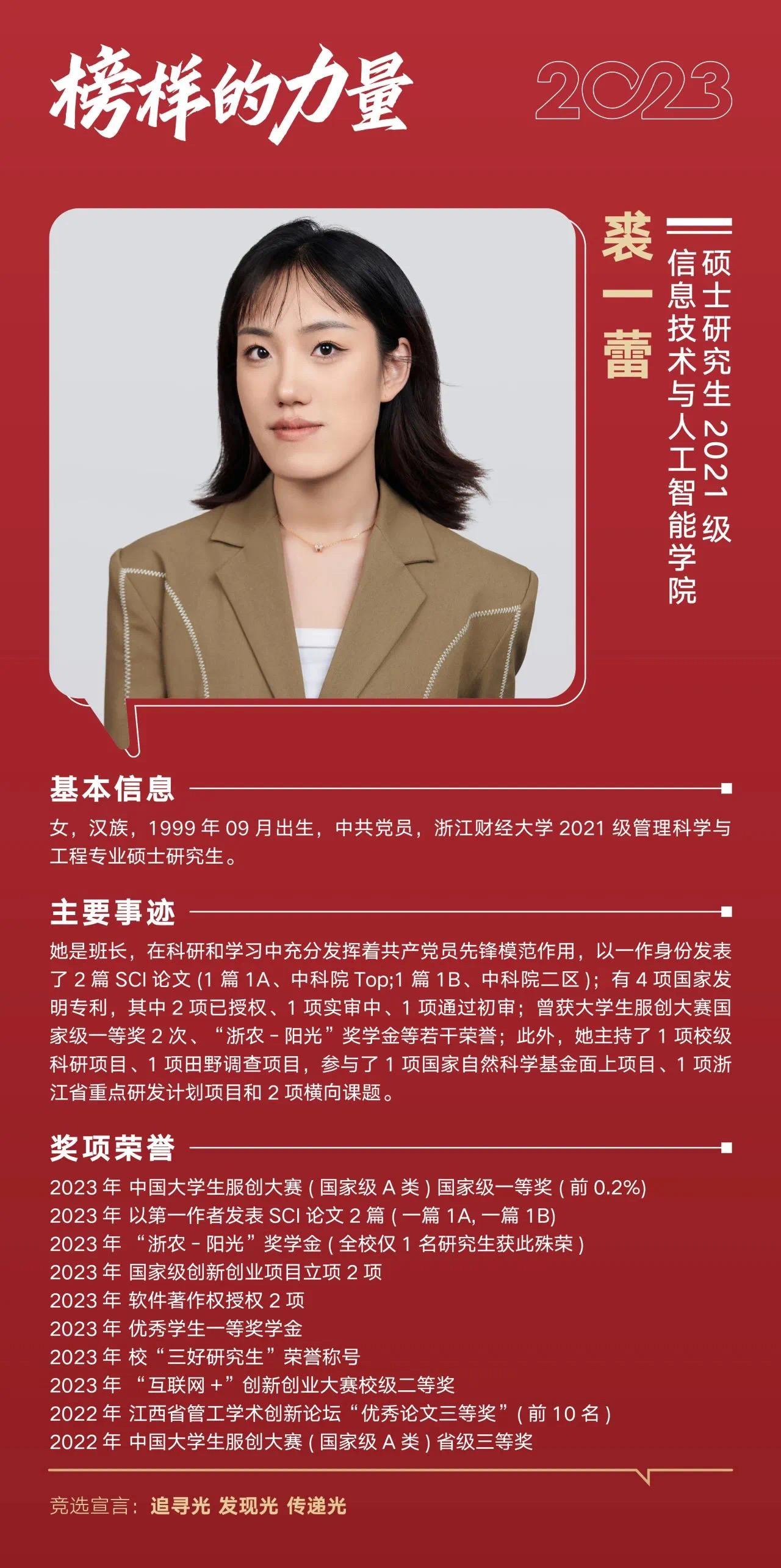 近日,suncitygroup太阳成集团公布2023年“十佳大学生”评选结果,太阳成裘一蕾获评2023年“十佳大学生”,李甫俊获评2023年“十佳大学生”提名奖。