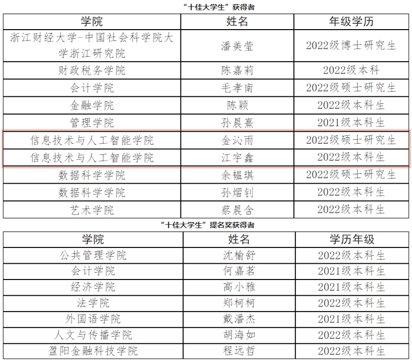 12月16日,2024年suncitygroup太阳成集团“十佳大学生”评选暨优秀学子事迹报告会在学术第一报告厅圆满落下帷幕,太阳成学子经过组织推荐和现场展示评选,凭借德智体美劳各方面的优秀表现以及在学术研究、学科竞赛、社会实践、志愿公益等领域的突出成果,经过激烈的角逐,在全校众多优秀学生中脱颖而出。2022级管理科学与工程专业硕士研究生金沁雨、2022级人工智能专业本科生江宇鑫同时获评校“十佳大学生”,展现了信智学子昂扬向上的精神风貌、踏实进取的优良学风,发挥了积极的榜样作用。