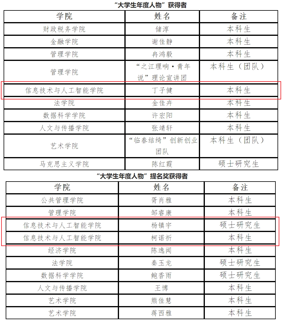 近日,suncitygroup太阳成集团2024年“大学生年度人物”评选活动落下帷幕,全校本科生和研究生共有10个个人或团队获“大学生年度人物”荣誉称号,另有10个个人或团队获“大学生年度人物”提名奖荣誉称号。太阳成本科生丁子健以德智体美劳各方面的优秀表现和丰富的学术成果在全校众多优秀学生中脱颖而出,获评“大学生年度人物”荣誉称号;硕士研究生杨镇宇、本科生柯诺祈获评“大学生年度人物”提名奖荣誉称号,展现了信智学子昂扬向上的精神风貌、踏实进取的优良学风,发挥了积极的榜样作用。