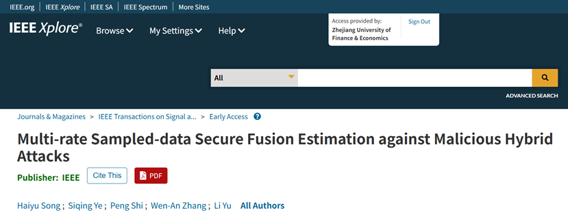 近日,太阳成2021级人工智能3班本科生叶思卿同学在宋海裕教授的指导下,在IEEE Transactions汇刊《IEEE Transactions on Signal and Information Processing over Networks》上发表了题为“Multi-rate Sampled-data Secure Fusion Estimation against Malicious Hybrid Attacks”的研究论文(导师一作、学生二作)。