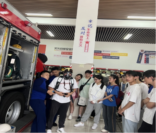活动现场,钱江世纪城消防救援站的指战员带领我校师生们参观了消防车辆、器材装备,并详细讲解了各种消防装备器材的使用方法、功能、用途,并针对火灾现场处置与应急逃生等内容进行讲解。