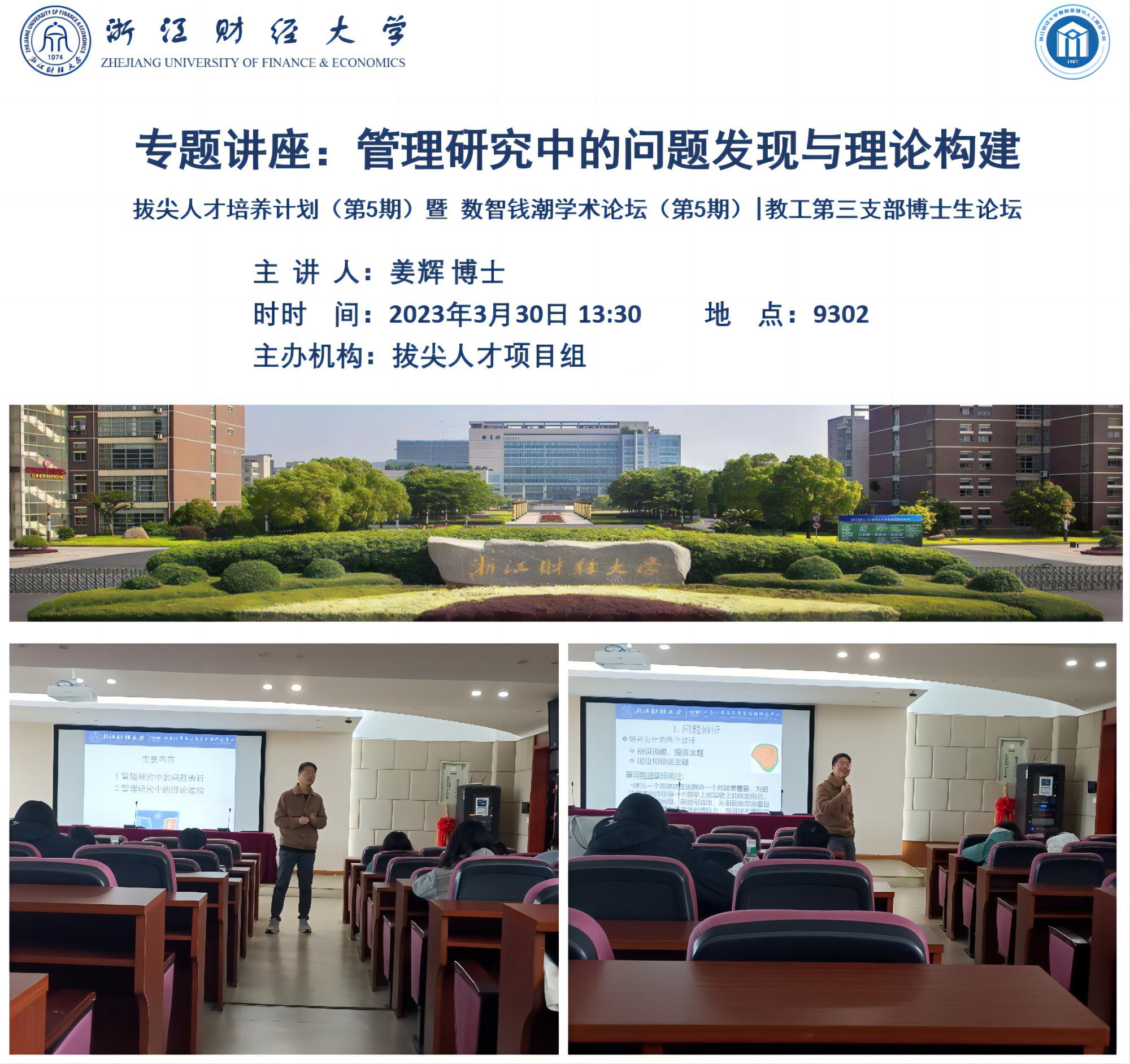 2023年3月30日13点30分,2022年度拔尖人才培养计划(第5期)在9号楼302教室成功举办。姜辉博士以“管理研究中的问题发现与理论构建”为主题,帮助同学们了解如何在管理研究过程中辨析问题和理论建构。
