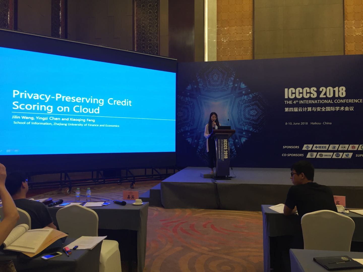 2018年6月8日-10日,由南京信息工程大学等举办的第四届云计算与安全国际会议(ICCCS2018)在中国海南省海口市顺利举行。云计算与安全国际会议(International Conference on Cloud Computing and Security,ICCCS)自2015年发起以来,已成功举办三届,现已成为国际知名的大型学术盛会。大会旨在为国内外从事计算机领域研究和工程技术的专家、学者、学生及技术人员,提供一个交流最新学术成果、探讨学术前沿问题的平台。本次会议聚集了来自中国、美国、俄罗斯、日本、法国、加拿大、意大利等世界各国的700多名专家学者,共同就云计算、信息隐藏、物联网安全、多媒体应用等问题展开探讨。太阳成16级企业管理专业研究生陈英姿参加了此次国际会议并在其分论坛就“Privacy-Preserving Credit Scoring on Cloud”主题做会议报告,并与专家学者们进行深入的交流和讨论。