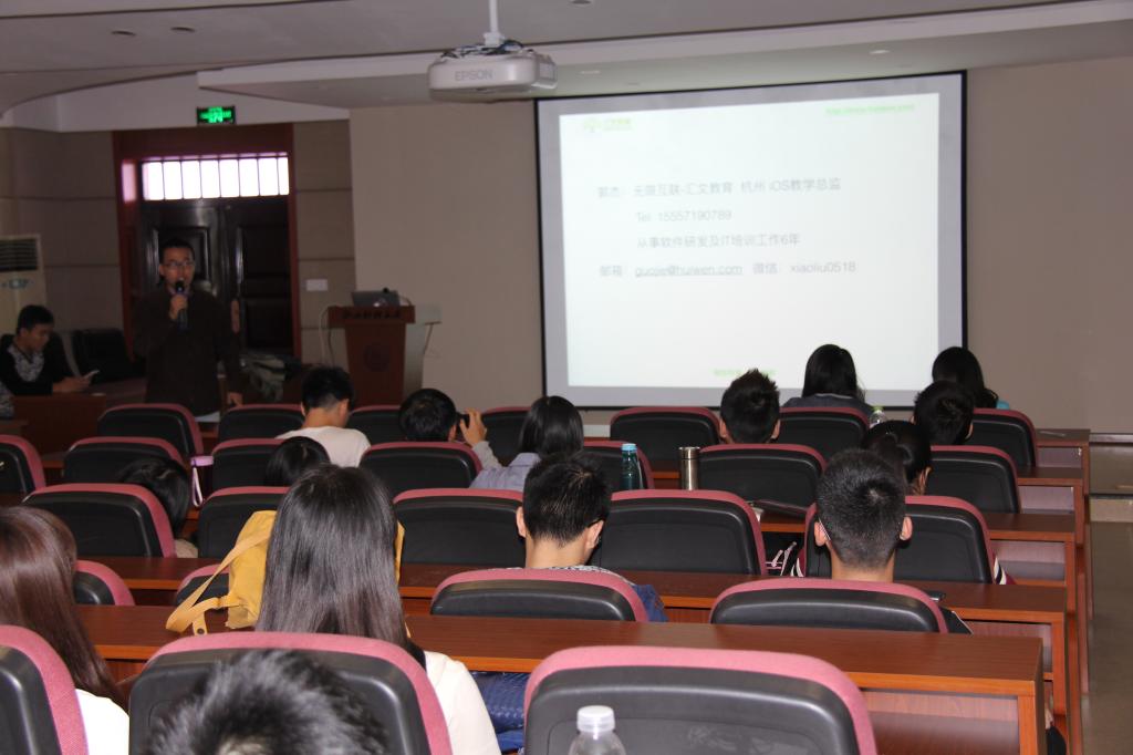 郭杰老师用幽默的语言、精彩的互动从一个逻辑小问题开始,引导大家进入讲座主题,介绍了自己以及一些iOS开发者喜欢从事此项开发的几大原因。随后,向同学们展示了一些生活中常见的并且短期能够开发案例,激发同学们学习的兴趣,鼓励大家进入到iOS开发的队伍中来。郭杰老师的讲座为太阳成学生呈现了一场精彩纷呈的教学盛宴。最后汇文教育提供免费6天短期培训的机会,让学生进入到实践中感受一下iOS开发。