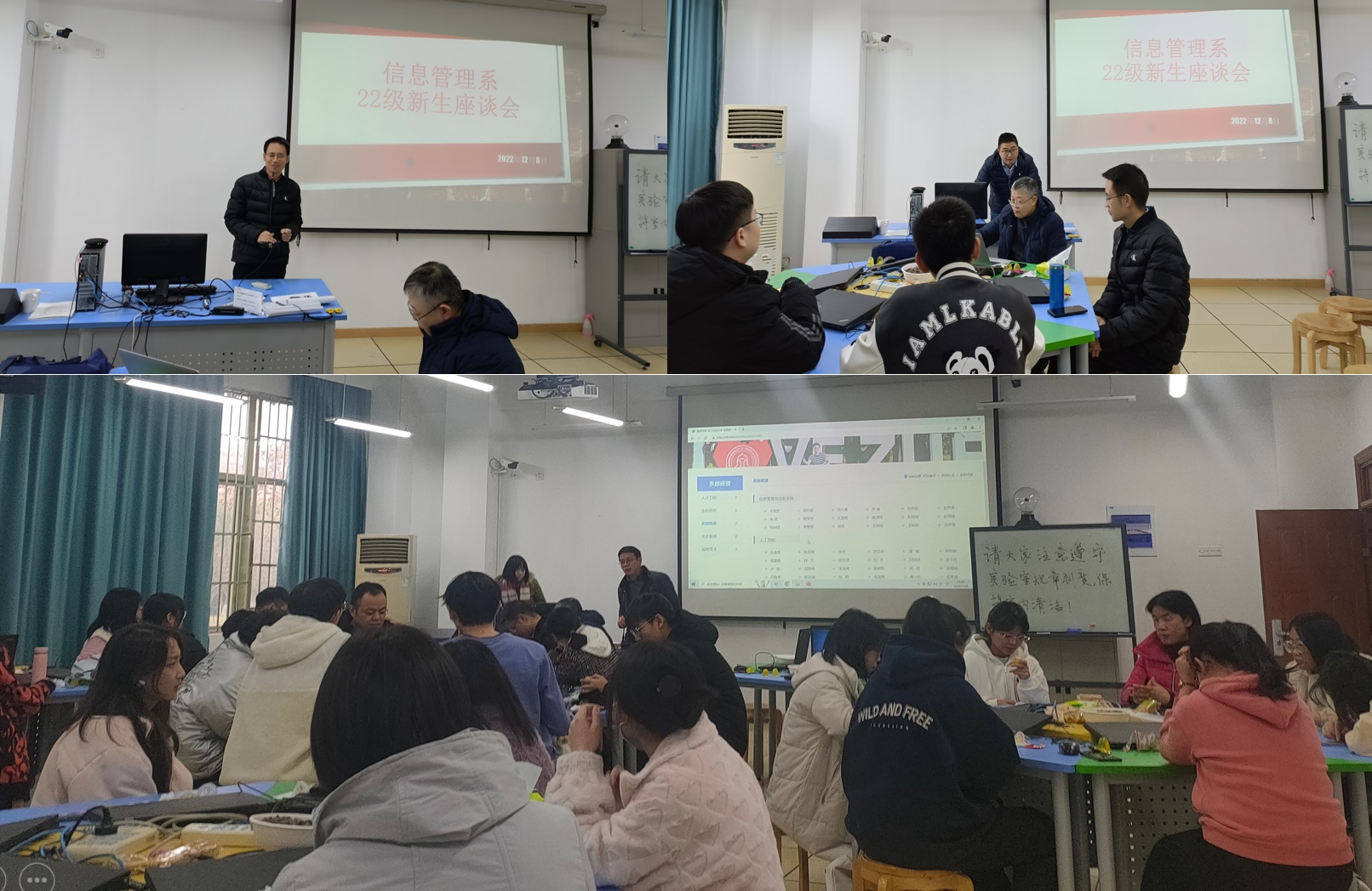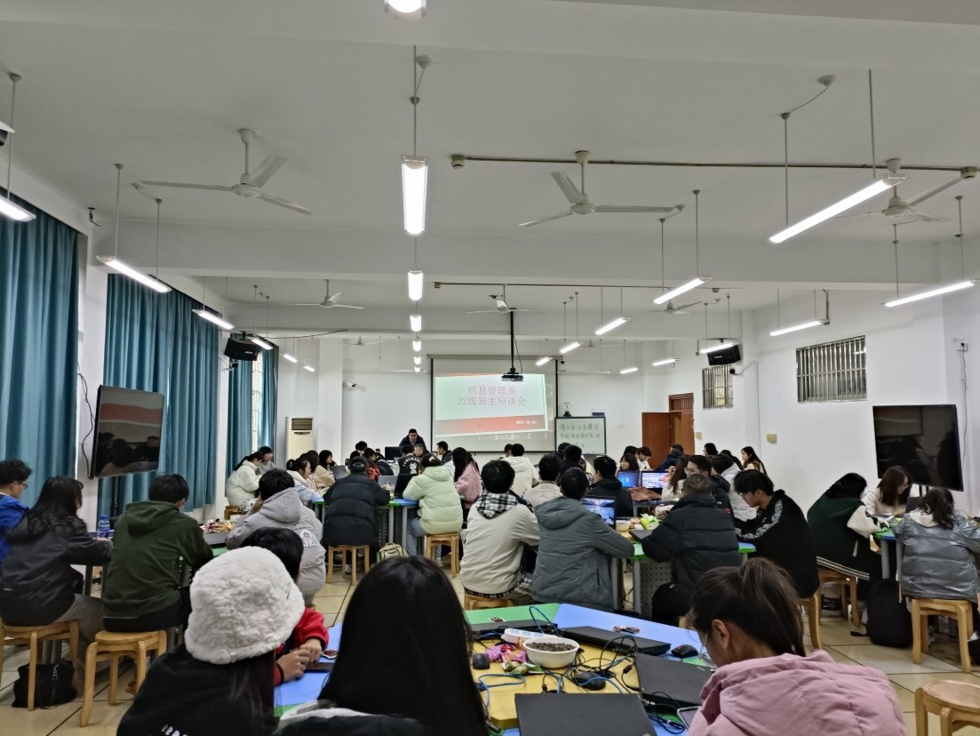 2022年12月8日下午,信息管理系与教工第一党支部在9-103顺利举行信息管理与信息系统专业2022级新生座谈会。会议由信息管理系主任刘维树主持,学院副院长兼信息管理与信息系统专业负责人隆清琦、教工第一党支部书记朱凌、实验中心主任章华、信息管理系全体教师以及2022级信管专业全体新生参加了本次座谈会。