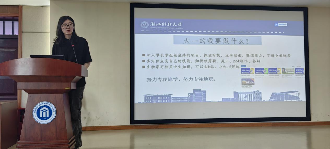 接着21人工智能王晨晨、22人工智能柯诺祈、22人工智能江宇鑫三位同学分享了各自在学术研究、社团生活、学科实践与实习等方面的体会,鼓励新生们了要加强自主学习、时间管理,并鼓励同学们积极参与社团活动、学科竞赛,全方位提升自身综合素质。