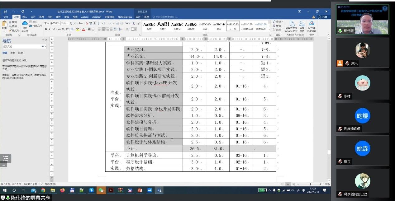 5月31日下午,软件工程系举行了2022级人才培养方案校外专家论证。此次论证会由软件工程系副主任涂乐主持,来自阿里巴巴和海康威视的两位技术工程师作为校外企业专家对软件工程专业2022级人才培养方案进行论证讨论,系部全体骨干教师出席。
