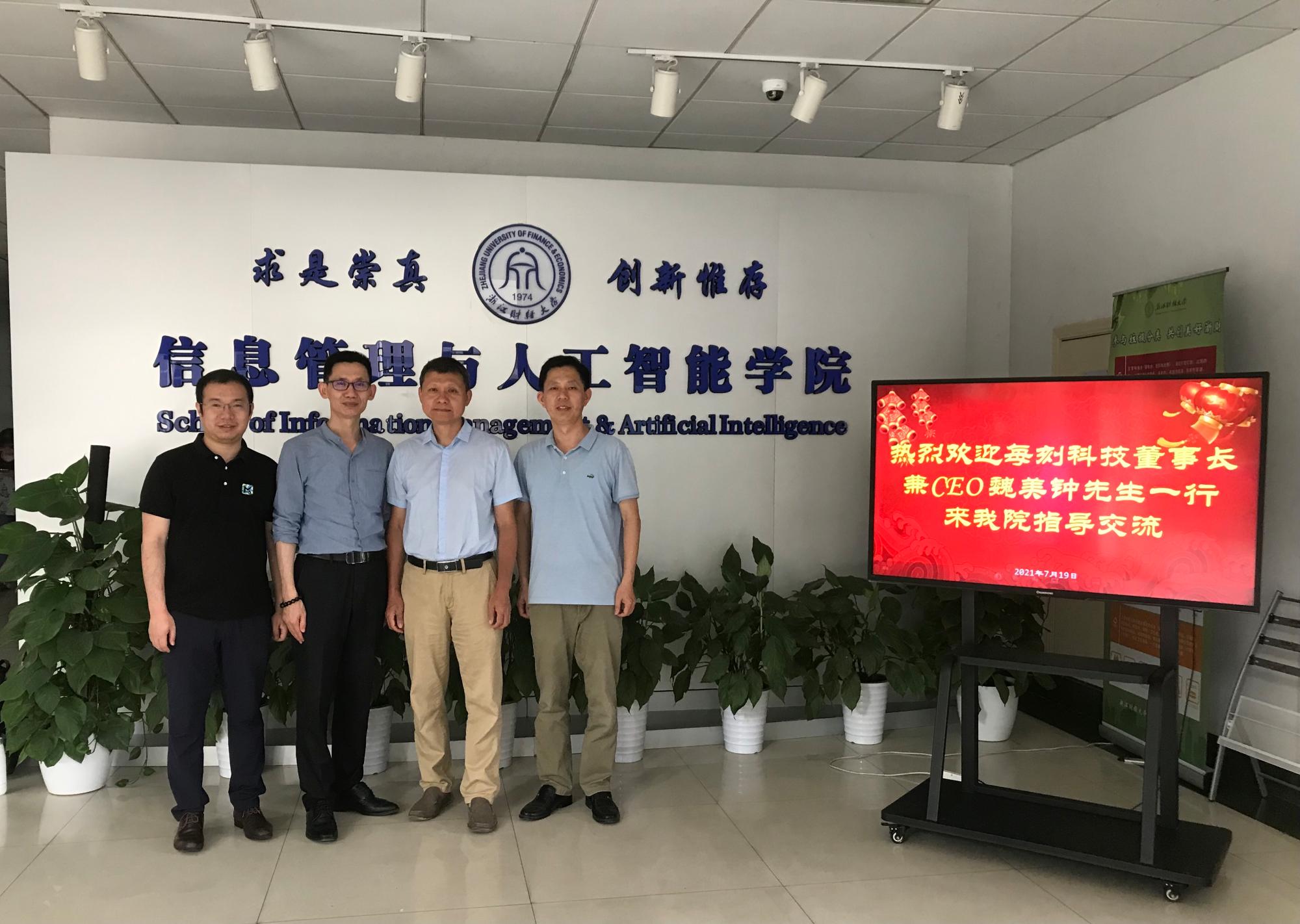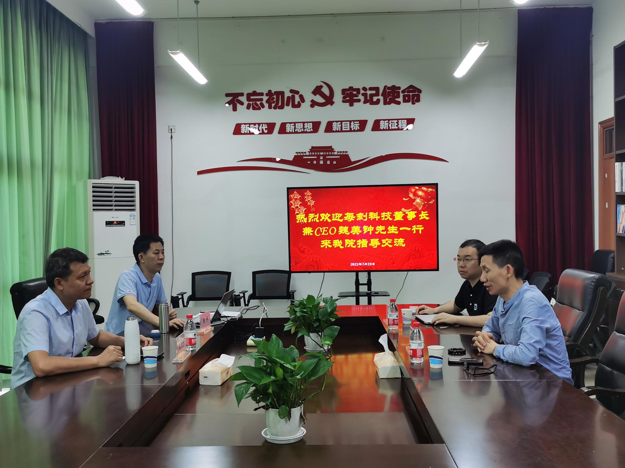 2021年7月19日下午,每刻科技公司董事长兼CEO魏美钟、联合创始人周军赞一行来太阳成洽谈人工智能校企合作事宜。学院院长张帅、人工智能研究院院长张文宇热情的接待了魏美钟一行。