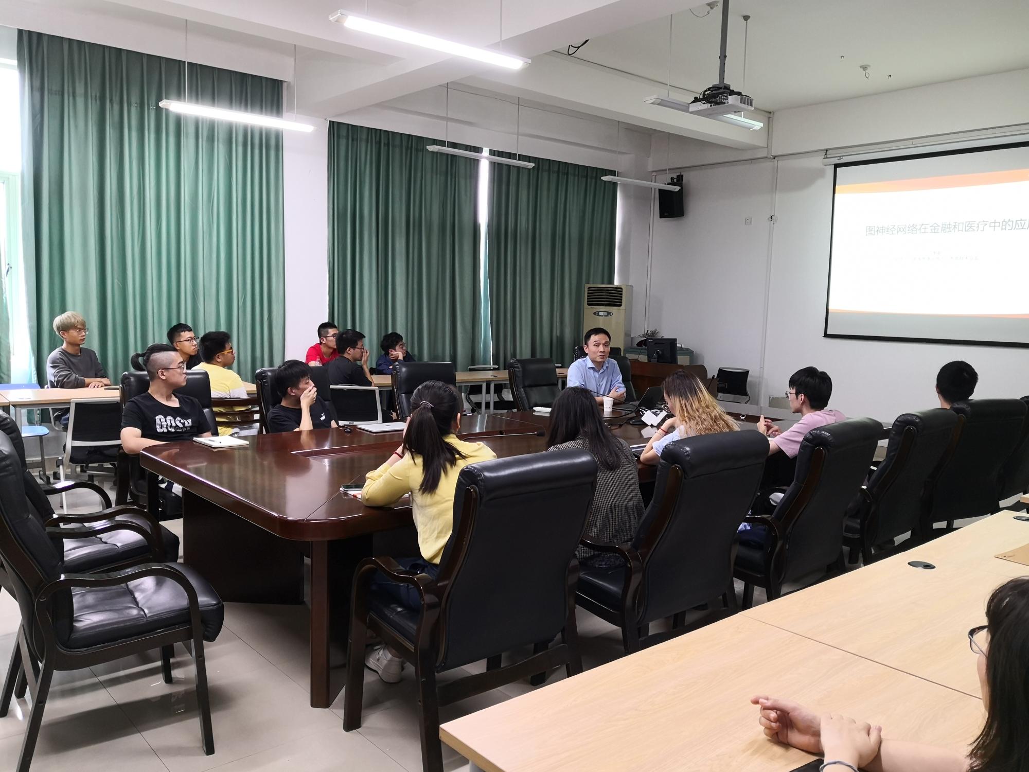 李朝博士首先给大家介绍了机器学习领域中的图神经网络方法,并讲解了图神经网络方法在金融和医疗领域中的应用情况。在后续的讨论环节中,李朝博士详细解答了同学们在人工智能学习中遇到的各种问题,为产学研服务提出了一些思路,对太阳成人工智能专业建设提供了许多宝贵的建议。两位老师还与李朝博士就后续的合作研究进行了讨论。