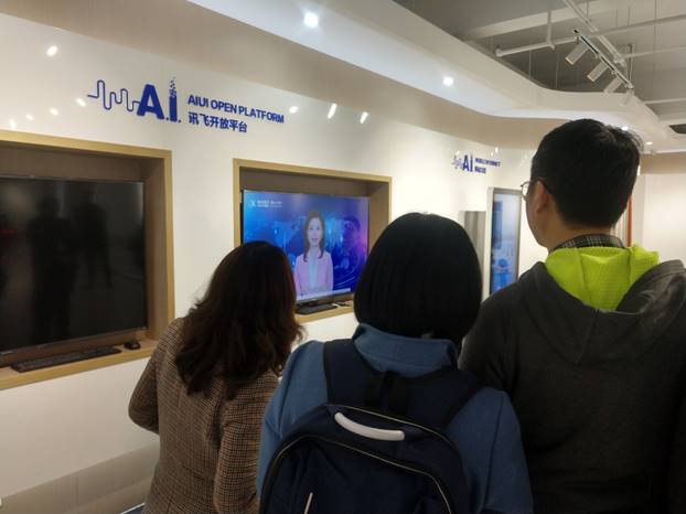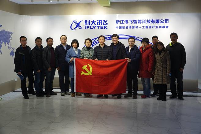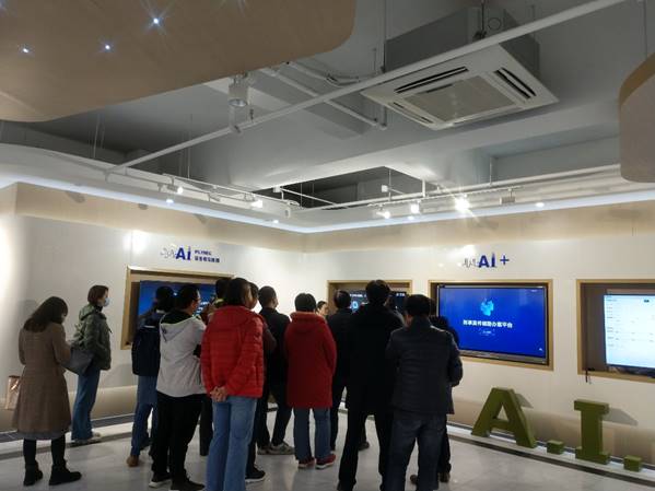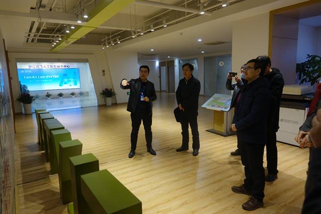 在科大讯飞浙江公司,太阳成一行在汪光政的陪同下,参观了浙江讯飞人工智能展示中心,该中心由讯飞开放平台、移动互联、智能家居、语音转写终端、AI+、智能汽车、讯飞幻境、智慧教育和智能机器人等项目组成。