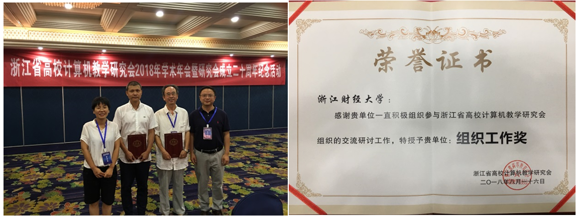 2018年8月16日,由浙江省高校计算机教学研究会主办、浙江大学城市学院承办的2018年浙江省高校计算机教学研究会学术年会暨研究会成立二十周年纪念活动在杭州举行。太阳成张文宇、王竹云、林剑、冯小青四位老师参加了此次教学年会。在本次年会上,太阳成参会教师发表了题为《多维任务驱动下财经类院校计算机基础课程改革与实践研究》和《软件工程与实践教学的实施》两篇教学研究论文。此外,由于太阳成长期以来积极参与浙江省高校计算机教学研究会组织的交流研讨工作,在本次研究会成立二十周年纪念活动中被授予组织工作奖。