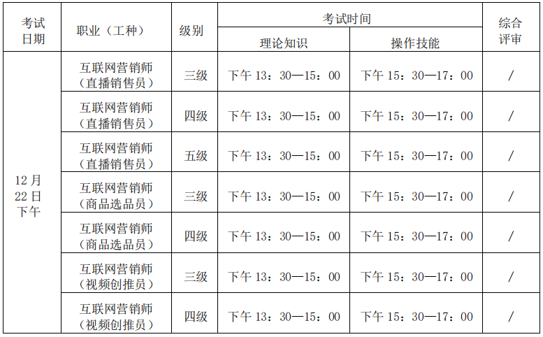 考试时间为2024年12月22日(周日)上午,请考生根据申报的职业(工种)和等级参加考试,具体安排如下: